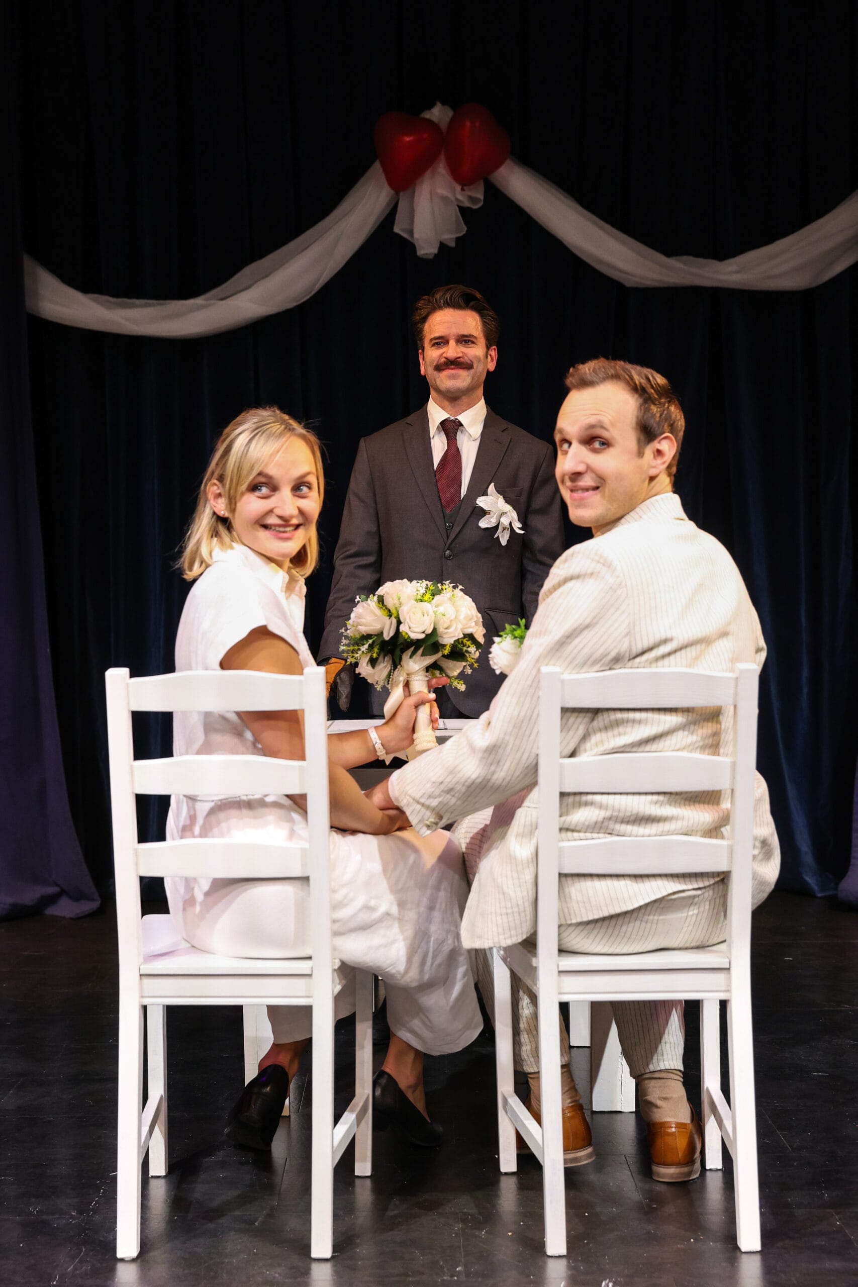 Die großartig gelungene Bühne von J-D Schwarzmann und Samuel Schwarzmann ist auf den ersten Blick schlicht – weiß, funktional, beinahe behördlich sauber –, entwickelt jedoch eine enorme Wandlungsfähigkeit. Ein Tisch, vier Stühle und zwei weiße Holzkisten reichen aus, um Standesamt, Behördenbüro, Hotel und Wohnung entstehen und wieder verschwinden zu lassen. Mit wenigen Handgriffen wird aus einem scheinbar harmlosen Möbelstück ein Bett mit Münzfernsprecher, ein Sitzmöbel, eine Bar oder eine Garderobe für Čeliks Regenschirm und Melone. Gerade diese modulare Wandelbarkeit verleiht der Inszenierung Tempo und erzeugt ein beklemmendes Gefühl permanenter Kontrolle: Nichts ist privat, alles lässt sich öffnen, inspizieren, verändern.