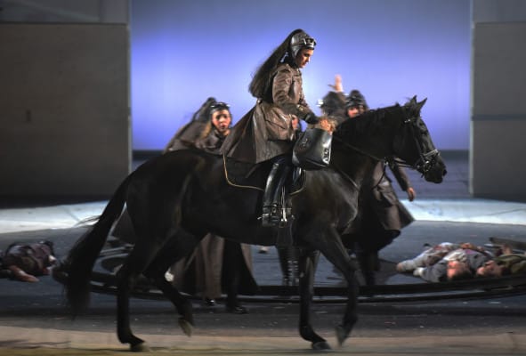 Folgerichtig führt Uwe Eric Laufenberg durch die Menschheitsgeschichte in zeitlichen, räumlichen und kulturspezifischen Abstufungen – von der Mythologie in den Orient zur altdeutschen Kneipe in einen Reitsaal mit einer an die Germania erinnernden Statue, zur Hochsicherheits-Festung von Fafner, die an Fort Knox erinnert, bis hin zur klassischen Gibichungen-Halle. Sinnstarke Videos von Falko Sternberg - das Rheintal mit der Burg Kaub, die strahlende Sonne, das magische Schwert Nothung, Massaker, Häuserschluchten einer Mega-Stadt, verheerende Atombomben-Explosionen, Panzer und Kampfflugzeuge, der apokalyptische Weltenbrand über den geschlossenen Toren von Walhall - teils drastisch aufgezeigt, ergänzen das Kaleidoskop seiner Deutung. Der Ausgangspunkt der Tragödie, der Raub des Goldes, findet in einem die Bühne dominierenden Auge statt. Aufsehenerregend, wie Rheintöchter und Alberich sich darin necken… Das ist nur das Vorspiel, danach beginnt der Lauf der Geschichte: Eindrucksvoll wie gestenreich Loge den Göttern am abendlichen Lagerfeuer vom Raub des Goldes berichtet, majestätisch der Einzug der göttlichen Beduinen nach Walhall, überraschend wie Siegfried statt eines Bären einen Punk vor sich hertreibt und zeitgemäß wie er den Feuerring mittels Algorithmen überwindet, effektvoll der Bezug zur Antike durch eine überlebensgroße Statue, monströs wie die Walküren wahllos junge Männer morden und deren Leichenteile umherwerfen, modern das Weben der Nornen mittels Laserstrahlen, überwältigend die pyrotechnischen Zaubereien, entsetzlich die Bombergeschwader… überzeugend die Personenregie. Uwe Eric Laufenberg ist an dieser großen Aufgabe nicht gescheitert, seine Inszenierung fällt positiv aus dem Rahmen.