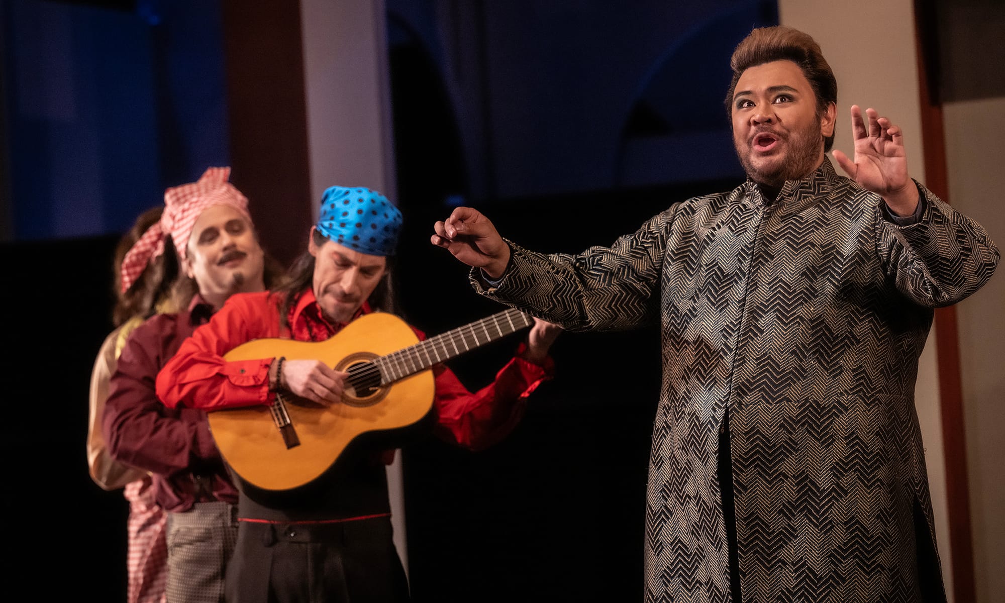 Die Oper beginnt mit einem Ständchen des Grafen Almaviva (gesungen von Jongyoung Kim) für seine angehimmelte Rosina. Der verliebte Graf kann sich ihr aber leider nicht nähern, sie ist im Haus des Alten eingesperrt. Also singt er ganz klassisch vor ihrem Balkon und hofft schmachtend, dass er sie hört.