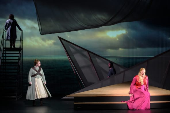Wie geht das Regie-Team (hier bestehend aus Martin Andersson für Konzept und Video sowie Edison Vigil für die Bühne) mit dieser herausfordernden Oper um? Erfreulich ist, dass nicht versucht wird, das Stück neu zu interpretieren oder ihm noch zusätzlich ein modernes Thema aufzubürden. Es genügt der Regie, das Werk für sich sprechen zu lassen, die wilde Geschichte einer unmöglichen Liebe einfach nur zu erzählen.