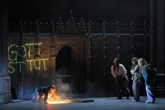 Getong Feng: Alberich schießt eine Rheintochter und sie ist verletzt. Die Bühne dreht sich um, Erda ist eine Nonne und sitzt in der Kirche. Die Zuschauer wissen noch nicht, dass sie Erda ist. Du gehst zu Erda und willst etwas mit ihr sprechen? Was ist hier gemeint?